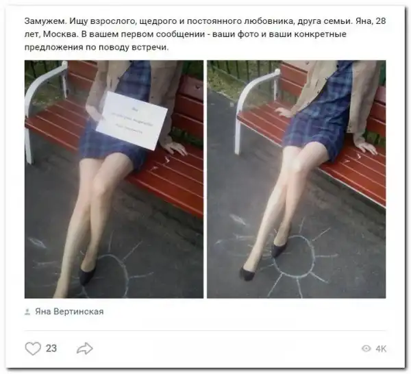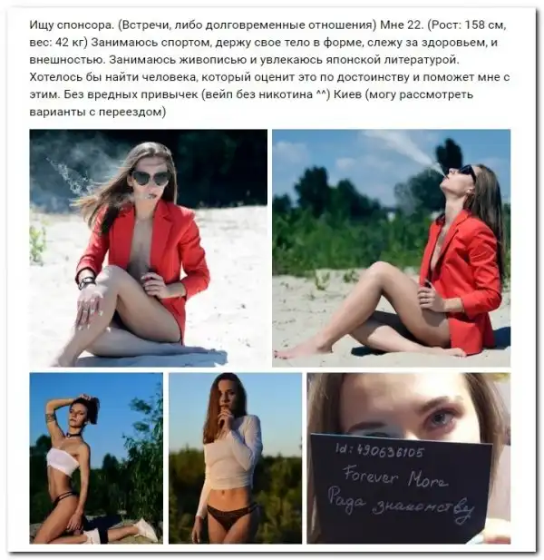 Эти наивные девушки хотят красиво жить и ничего не делать. Они надеются, что богатые спонсоры увидят их красоту, и в очередь выстроятся, предлагая свою помощь. Некоторые даже пишут, что никого интима, им должны заплатить чисто за приятное общение.