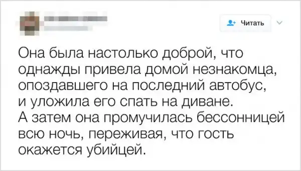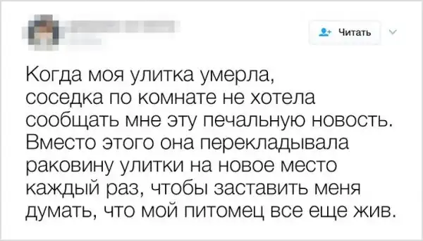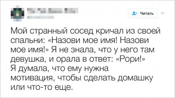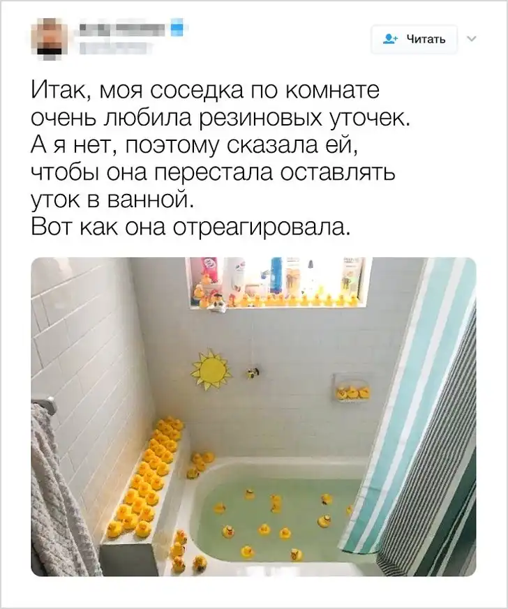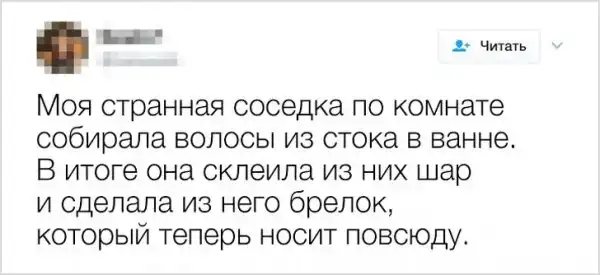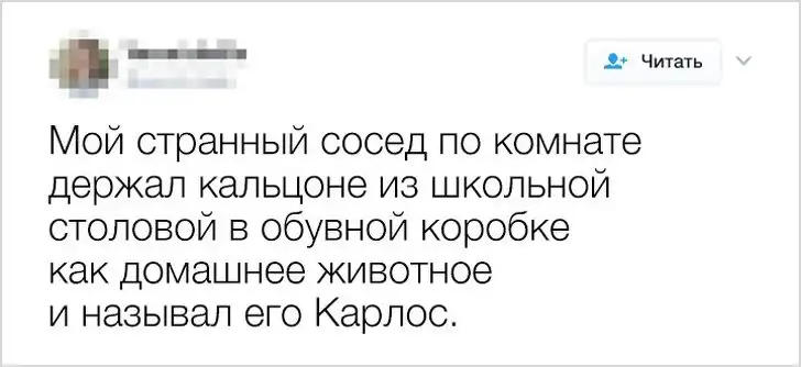 «А в вашей жизни были действительно странные соседи?» — с таким вопросом американский ведущий Джимми Фэллон обратился к своим подписчикам в твиттере. И, как оказалось, поклонникам Фэллона было о чем рассказать: сожительница, заполонившая ванную резиновыми уточками, студенты, державшие в комнате четырех куриц в подгузниках, парень, разговаривавший с кальцоне, — все эти люди попали под тег #МойСтранныйСоседПоКомнате (#MyWeirdRoommate).