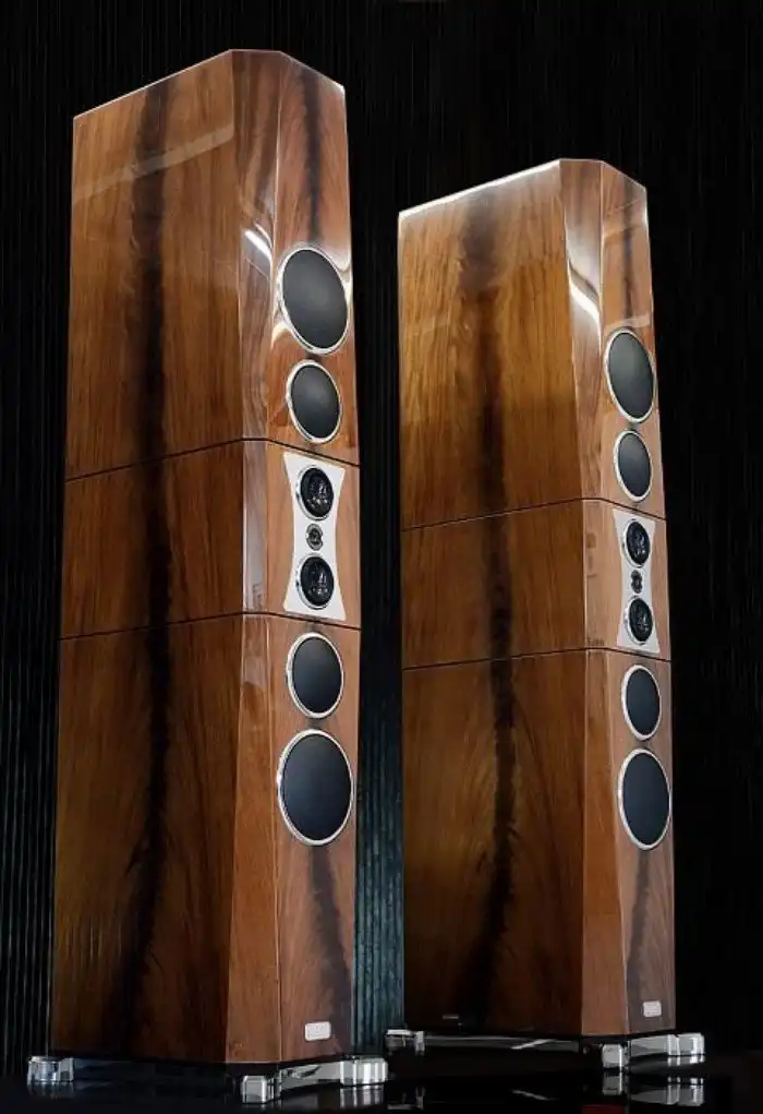 Фирменные всенаправленные драйверы DDD с карбоновыми диафрагмами, АЧХ 16 -24 000 Гц, отдельные басовые модули – все по канонам жанра. Для раскачки потребуется три усилителя на каждую полосу (200 – 350 Вт), тогда колонки смогут развивать звуковое давление до 120 дБ.