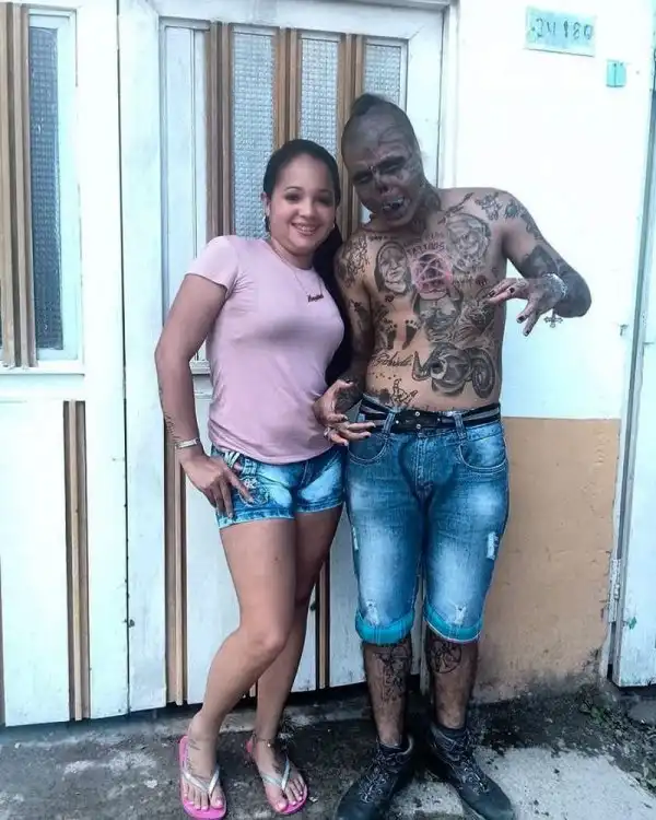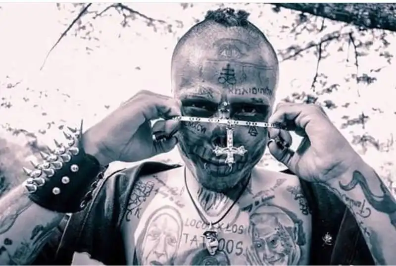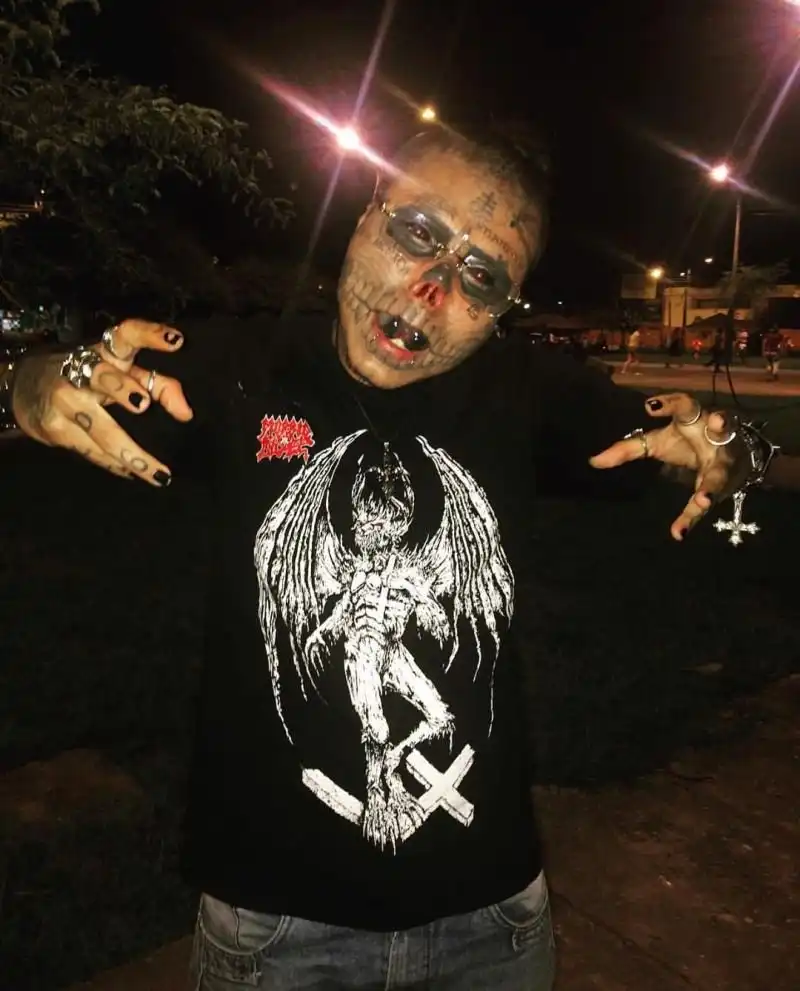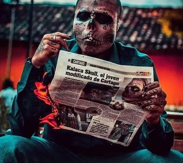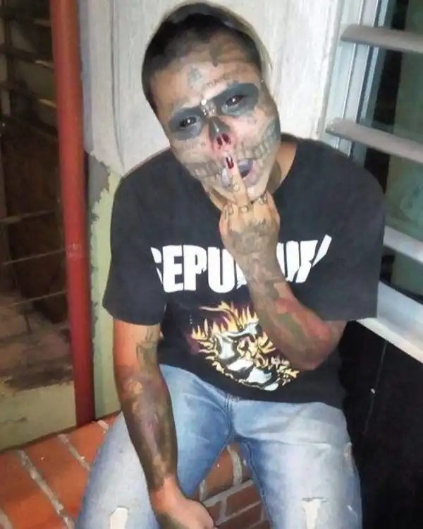 22-летний колумбиец Эрик Айнер Хинкапи Рамирес изуродовал себя, чтобы сделать лицо максимально похожим на череп. Он удалил часть носа, обкорнал свои уши и забил лицо татуировками. Кроме того, Калака Череп (так он себя величает) разрезал язык и сделал его сине-серым. В планах колумбийца - полностью завершить превращение лица в череп, пройдя еще ряд процедур.