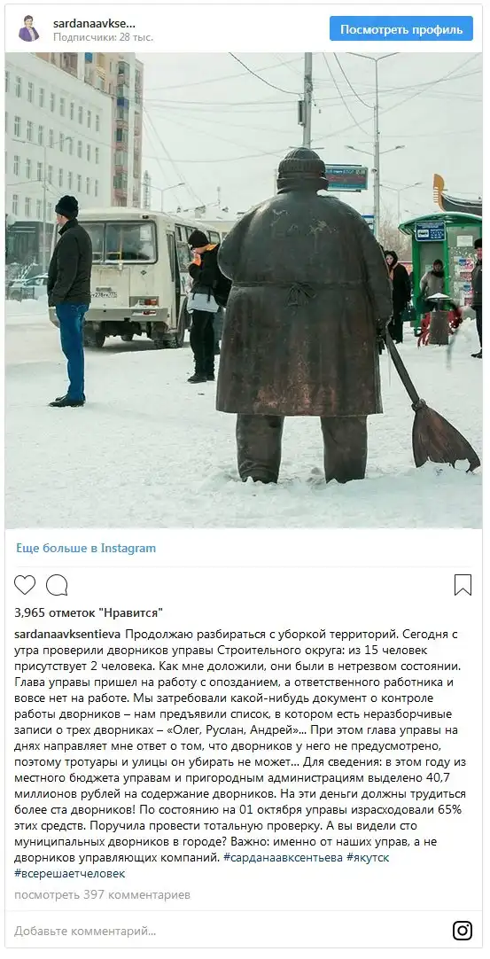 И вновь мэр Якутска оказалась в центре внимания после своей сегодняшней публикации. Как стало известно, Сардана Авксентьева решила отменить банкеты и гулянья за счет городского бюджета, из которого на услуги по организации питания планировалось выделить более 1 миллиона рублей. Когда она решила разобраться в этой ситуации, информация подтвердилась, хоть она не давала никаких распоряжений о проведении "массовых гуляний".