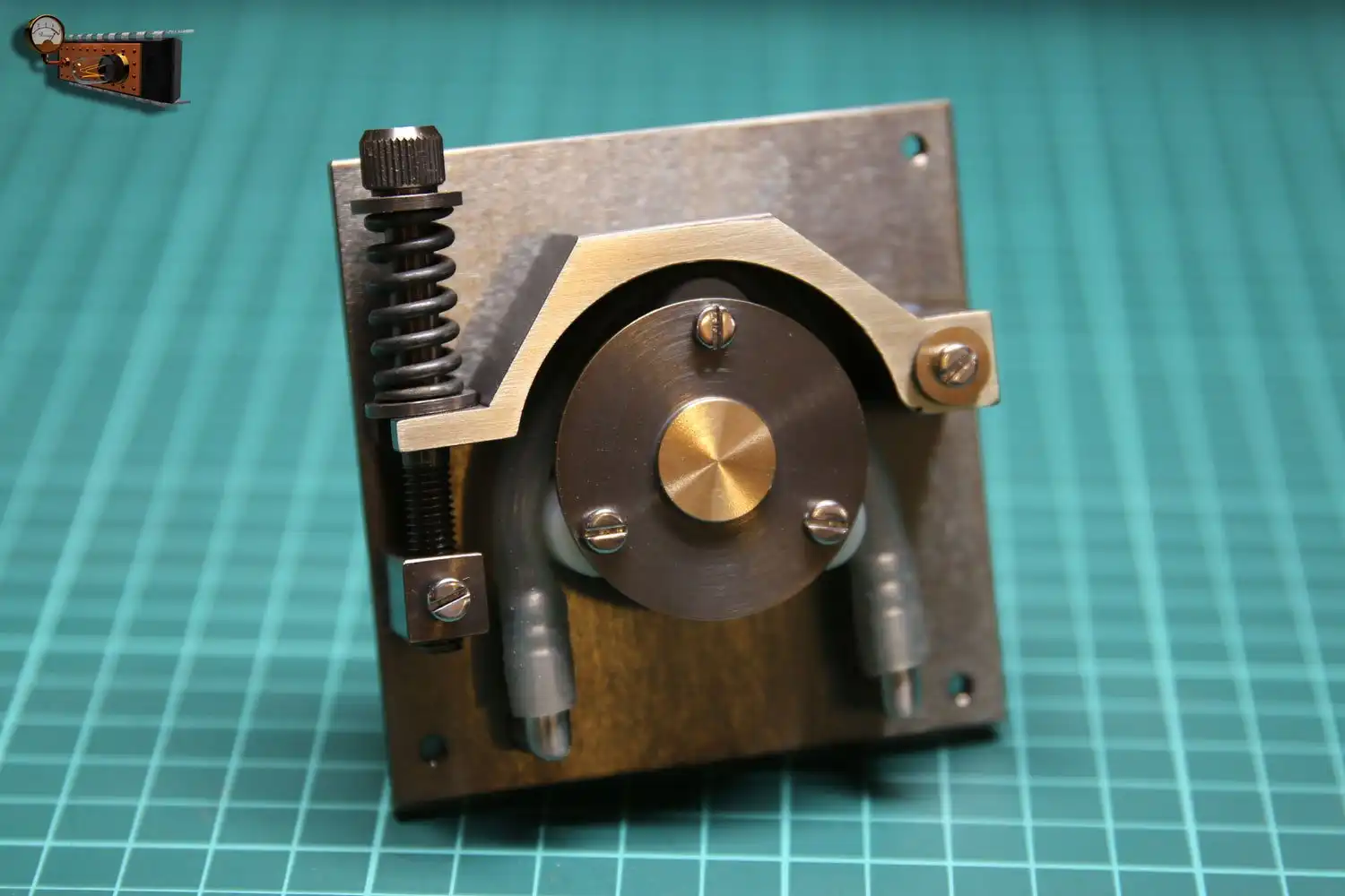 Каретка имеет один ведущий и два прижимных ролика, один из прижимных роликов расположен на подвижной подпружиненной кулисе, это позволяет каретке не терять сцепление с направляющими.