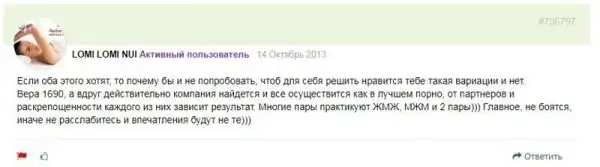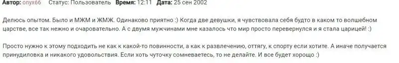 А теперь уберите детей от экранов. Сейчас мы узнаем, как посетители различных форумов относятся к экспериментам в постели. Перед вами рассказы реальных людей, которые многое попробовали в своей жизни. Действительно, может быть уже хватит стесняться?