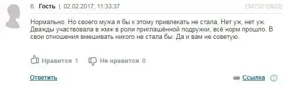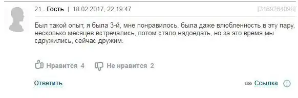 Огромное количество людей не одобряет подобные вещи. По их мнению, третий в постели - это аморально