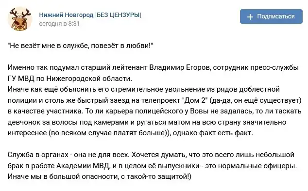 Совсем недавно мы рассказывали вам о том, как на проект "Дом-2" отправилась сотрудница Самарской полиции Анастасия Липатова, но теперь и Нижний Новгород решил не отставать. Как стало известно, старший лейтенант Владимир Егоров решил уволиться из пресс-службы Нижегородского Главка, чтобы отправиться строить свою любовь на "Дом-2". Такими темпами можно будет открывать отдельный телепроект только для сотрудников правоохранительных органов.