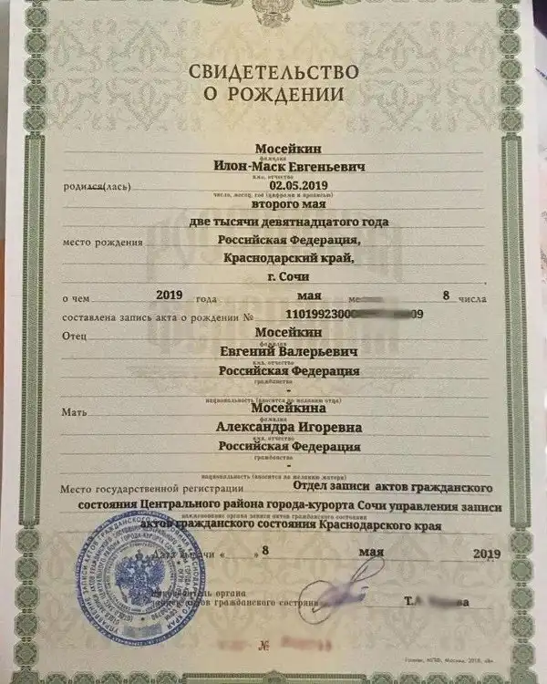 Семья Мосейкиных из Сочи 2 мая отмечала праздник, ведь в их семье появилось пополнение - мальчик. Это был уже третий ребенок в семействе, поэтому родители решили креативно подойти к выбору его имени... Семейная пара на протяжении почти двух недель скрывала имя своего малыша, но на днях они удивили всех опубликованным свидетельством о рождении, в котором черным по белому сказано, что их сына зовут "Мосейкин Илон-Маск Евгеньевич".