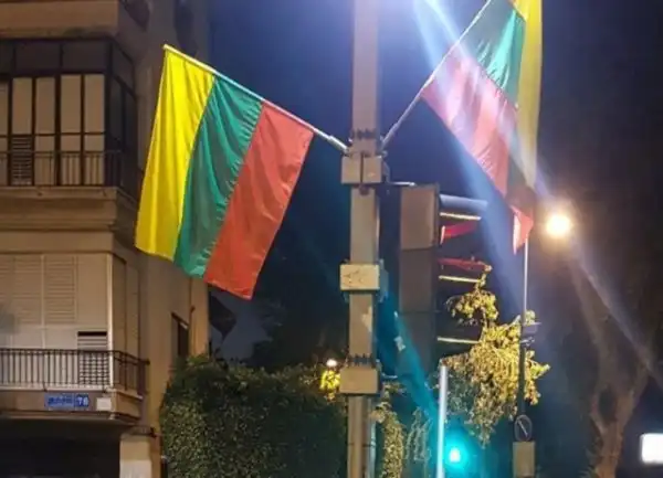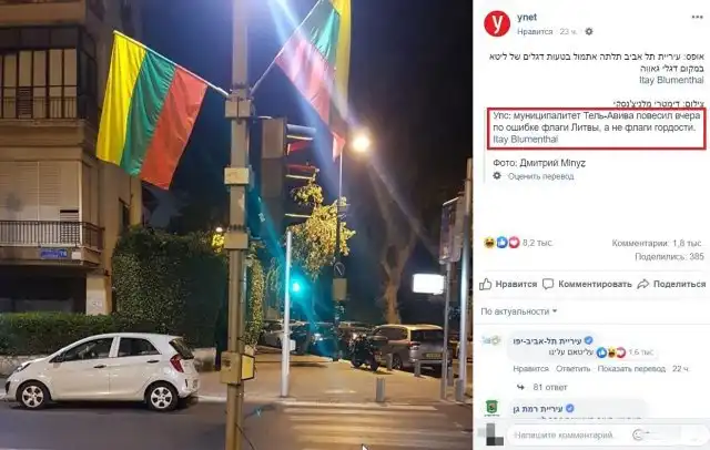 Очевидцы сфотографировали развешенные радужные флаги в Тель-Авиве, которые на самом деле являются вовсе не символом ЛГБТ, а флагом Литвы.
