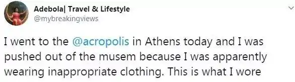 По словам Совемимо, во время посещения Акрополя к ней подошла женщина-полицейский и потребовала покинуть музей. Когда Адебола попросила указать причину, ее силой начали направлять к выходу.