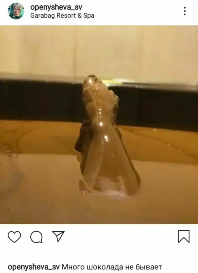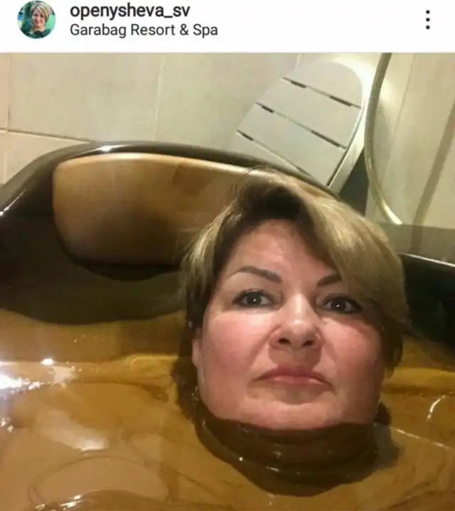 Опенышева отдыхала в пятизвездочном отеле Garabag Resort & Spa. На прошлой неделе чиновница выложила фото, на котором она принимает ванну с нафталаном - лечебной нефтью. Но Опенышева решила: пусть подписчики думают, что это шоколад, и подписала фото «Много шоколада не бывает».