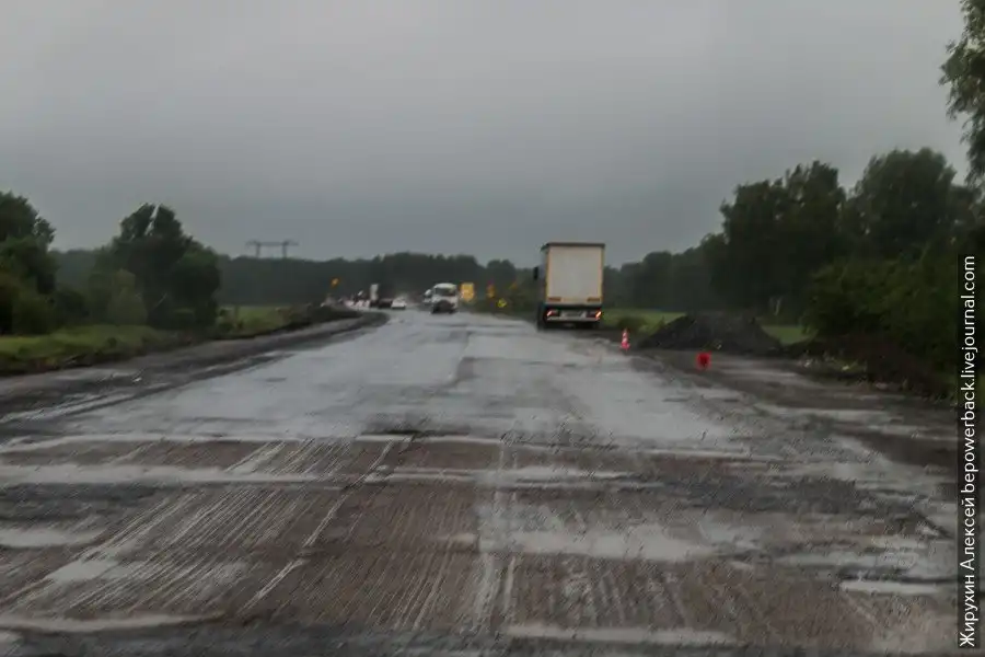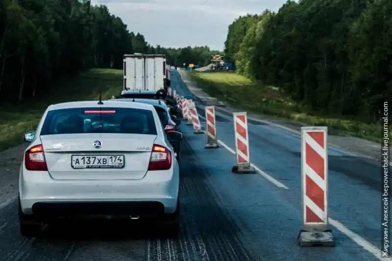 На этом участке сейчас попадалось огромное количество ремонтных работ, где можно в ожидании очереди простоять около часа. На обратном пути мне даже пришлось объезжать затор по проселочным дорогам идущих вдоль трассы поселков.