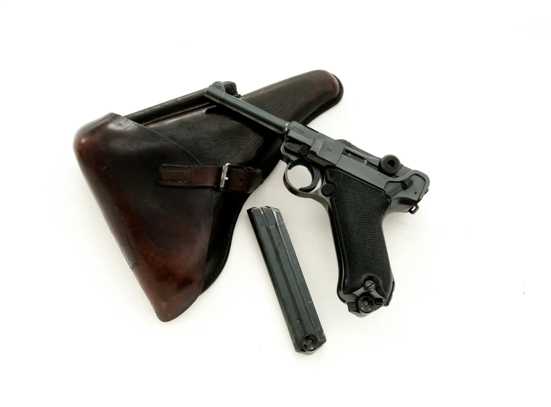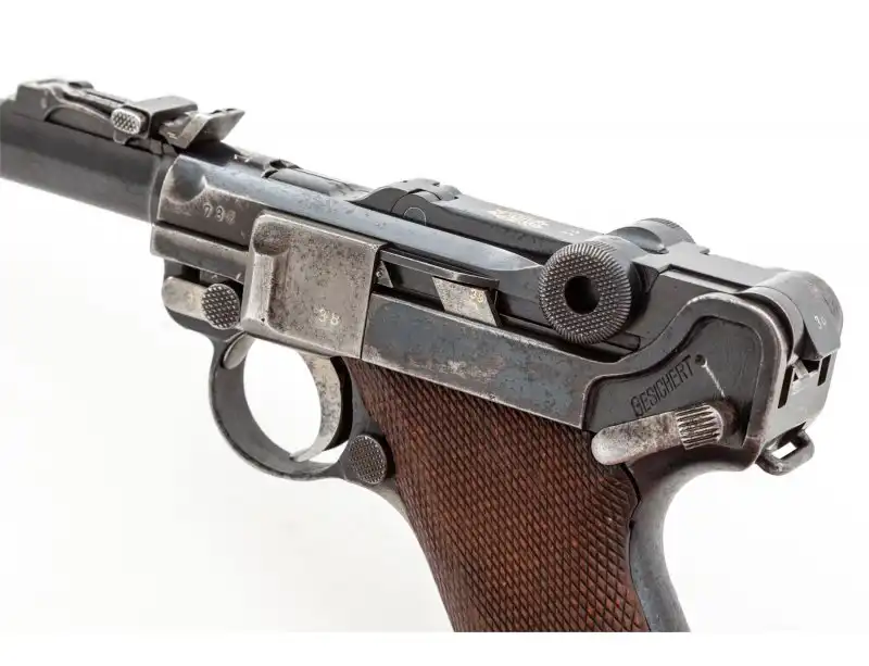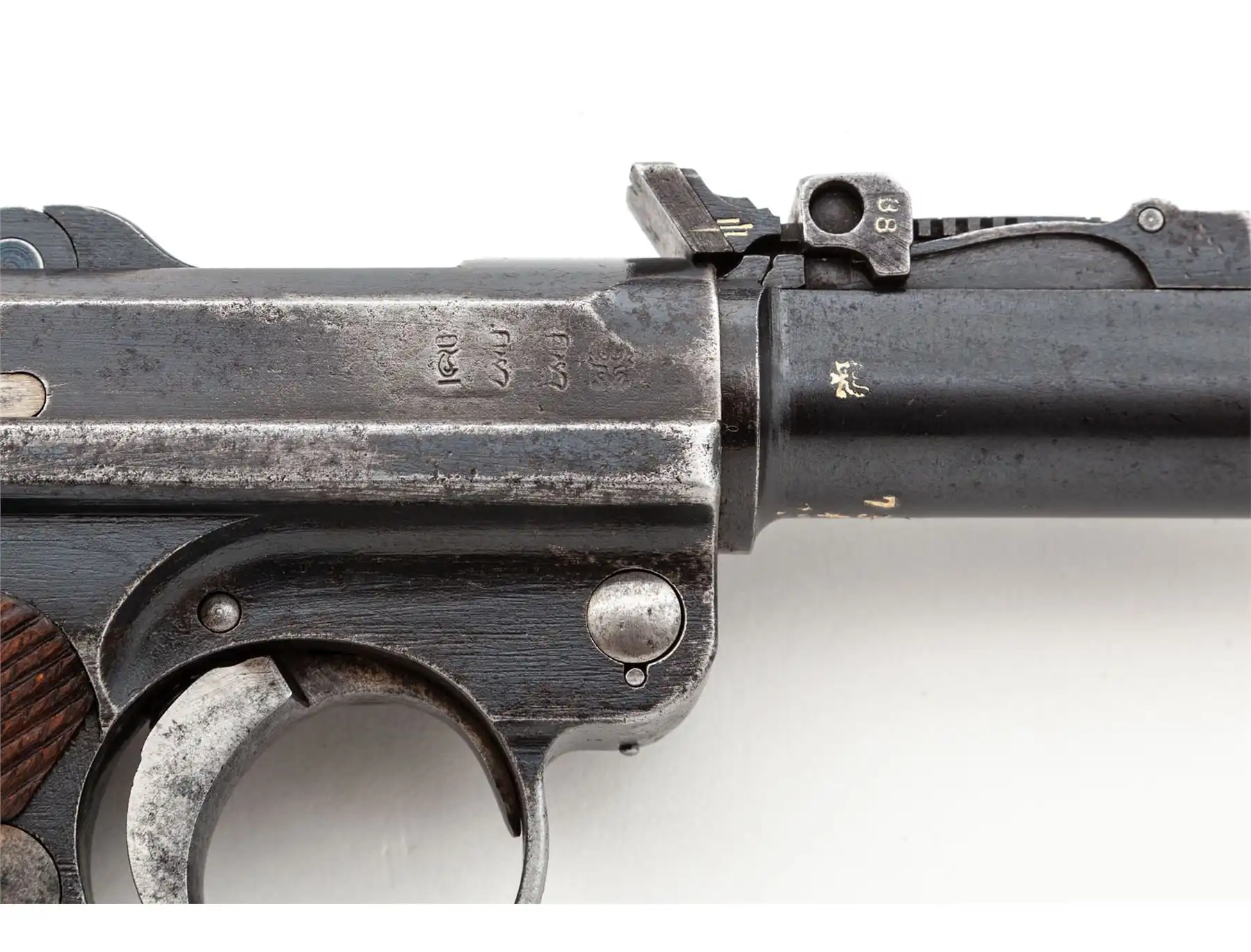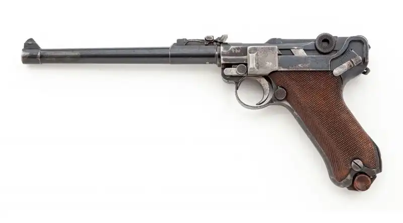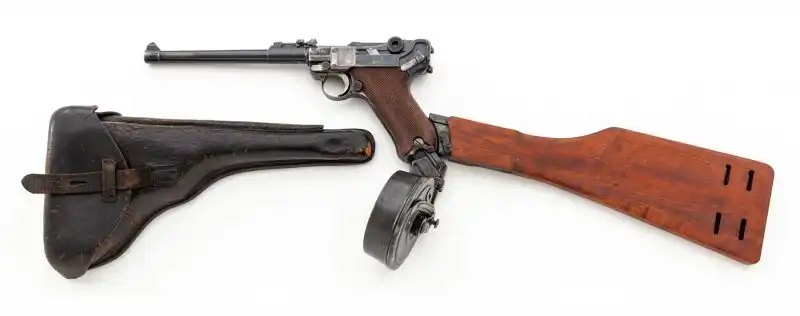 "Артиллерийская модель" пистлета системы Борхардта-Люгера образца 1914 года. 200-мм ствол калибра 9x19, приставной приклад-кобура и барабанный магазин ёмкостью 32 патрона.