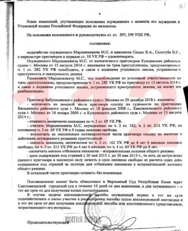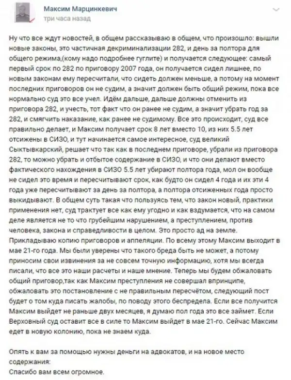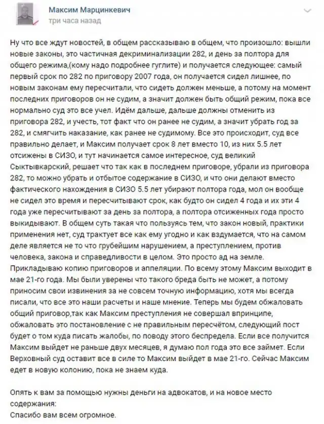 Когда срок пересчитали, получилось, что «Тесак» может покинуть колонию в мае 2021 года. Защита полагает, что Марцинкевича суд должен просто отпустить.