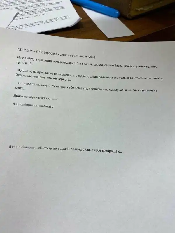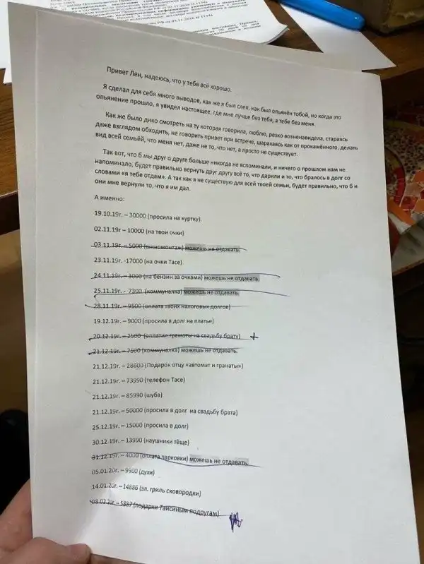 В конце письма мужчина написал: “Я думаю, ты прекрасно понимаешь, что я дал тебе гораздо больше, а это только то, что свежо в памяти. Остальное можешь также вернуть. Если все-таки ты хочешь что-то себе оставить, прописанную сумму можешь закинуть мне на карту. Долги на карту тоже скинь”. В свою очередь, молодой человек, пишет, что все что ему дала девушка или подарила, он возвращает. Кстати, судя по зачеркнутым суммам, что-то уже начали возвращать – правда, совсем какую-то мелочь.