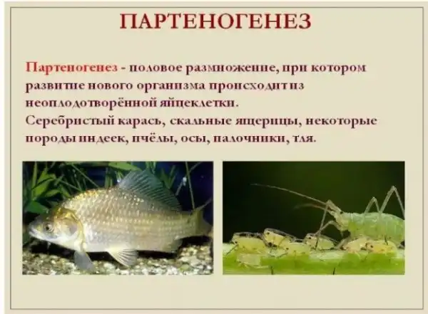 Возможно поэтому партеногенетический способ воспроизводства до сих пор встречается у некоторых рыб. Например, серебристый карась, живущий в озерах Кавказа, не имеет в своем виде мужского пола вообще. Все до единой рыбы мечут икру и потомство, из нее развившееся, тоже является женскими особями.