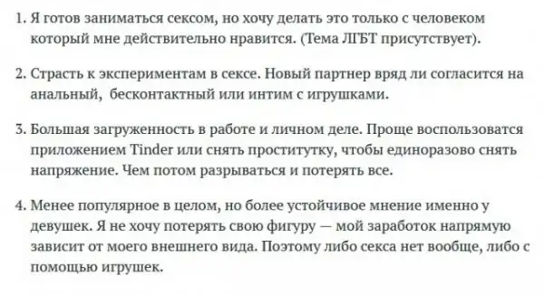 «Я люблю Витю. Искренне. И никогда не заведу другого. Но сейчас мы скорее партнеры: я занимаюсь раскруткой своего канала правильного питания, он — работает на фрилансе. Дополнительно ведем общее дело. Беседуем в основном через мессенджеры. Секс есть, когда мы вместе ложимся в кровать. А не один будит второго — это бесчеловечно».