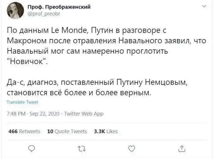 «Владимир Путин сообщил французскому коллеге: «Навальный мог сам проглотить этот яд».