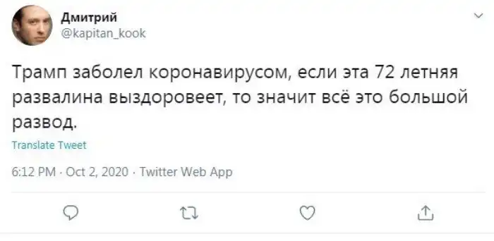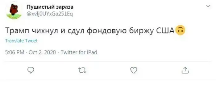 Президент США Дональд Трамп и его жена Мелания заразились коронавирусом. Об этом глава государства сообщил на своей странице в Twitter. Американский лидер написал, что тест на наличие инфекции у него и его супруги дал положительный результат. Реакция пользователей соцсетей готова. А что по этому поводу думаете вы?