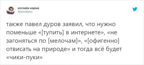 Пламенный манифест Павла Дурова русскоязычных пользователей не впечатлил. По их мнению, он просто поделился прописными истинами. Поэтому народ просто посмеялся над "проповедью" Дурова, сравнив ее с советами из "пацанских пабликов".