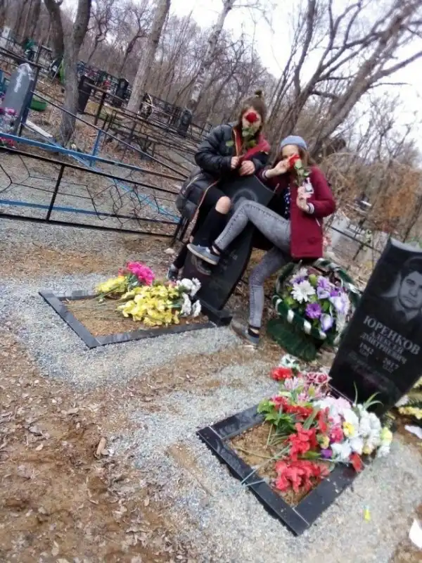Тупые шалавы на кладбище и мемориале. Мозгов нет абсолютно