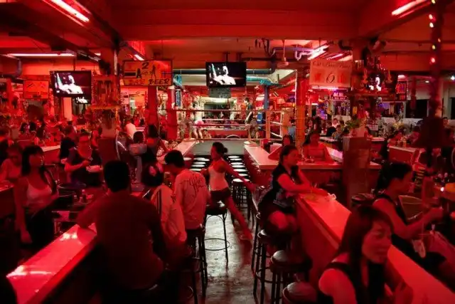 Сцена из бара Go-Go в районе красных фонарей. «Барменши» танцуют на сцене и сидят на стульях в ожидании клиентов