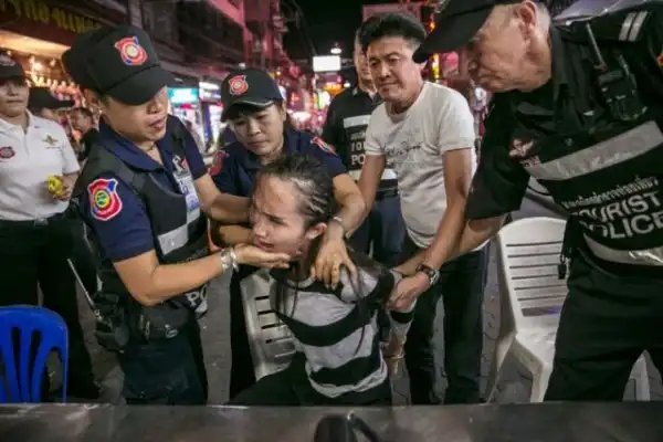 Тайские ледибои подписывают документы во время задержания, прежде чем отправиться в полицейский участок