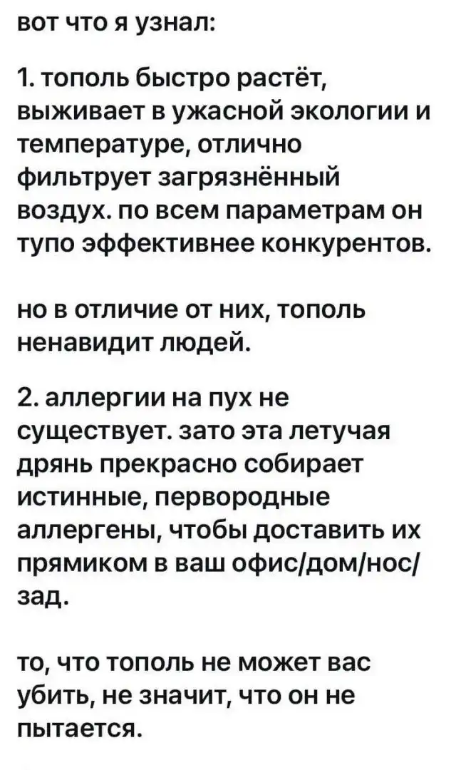 Тополь же рос быстро, давал много листвы и чистил воздух и прикрывал фасады, заляпаные навозом