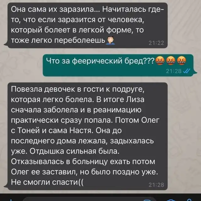 Женщина взяла своих дочерей и отправилась в гости к знакомой, которая на тот момент была больна коронавирусом. План, конечно же, сработал, младшая дочь попала в реанимацию, а позже заболели муж и старшая дочь, а после и сама Анастасия. Несмотря на это женщина не торопилась обращаться к врачам. И впоследствии она скончалась. Младшую дочь Анастасии перевели из реанимации. Она все еще находится в больнице. Муж покойной и ее вторая дочь переболели в легкой форме.