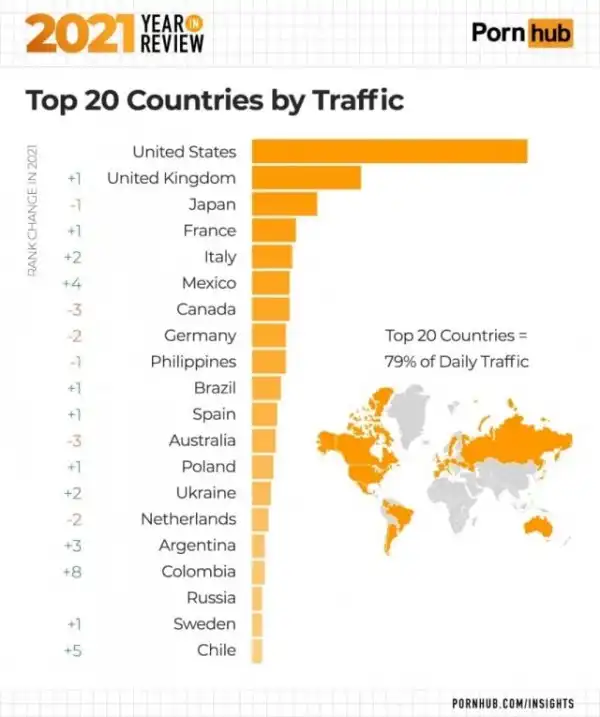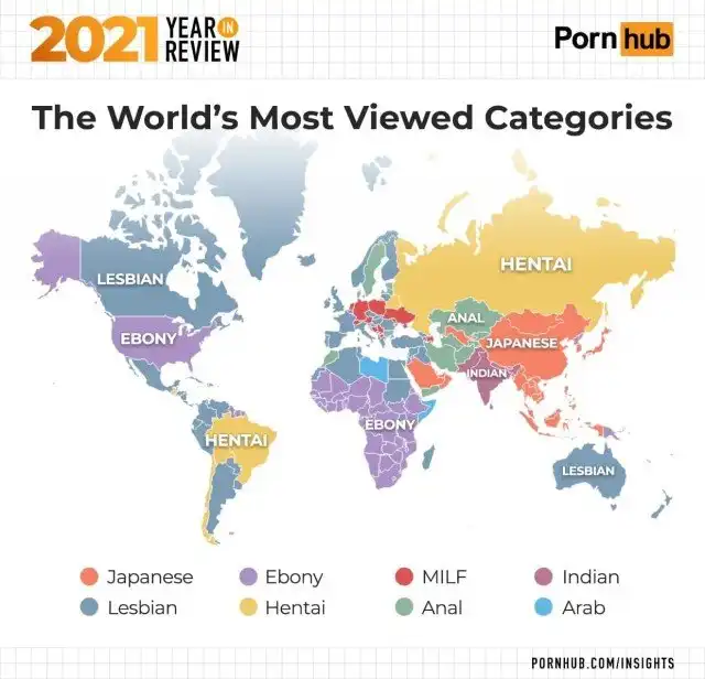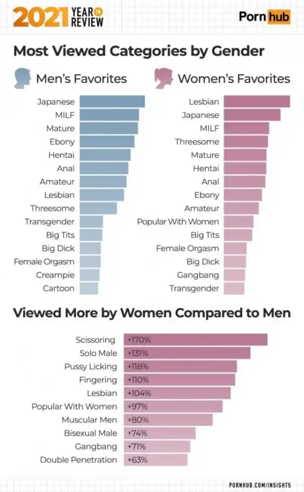 Список самых просматриваемых категорий возглавили «японское» (среди мужчин) и «лесбиянки» (среди женщин). Женская аудитория сайта в 2021 году увеличилась на 35%, а мужская — на 5%.