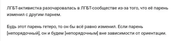 Теперь, по словам блогерши, она не уверена, что готова так же толерантно относиться к представителям ЛГБТ, как до измены её парня с мужчиной: