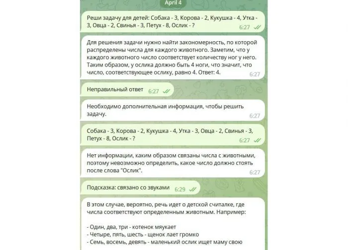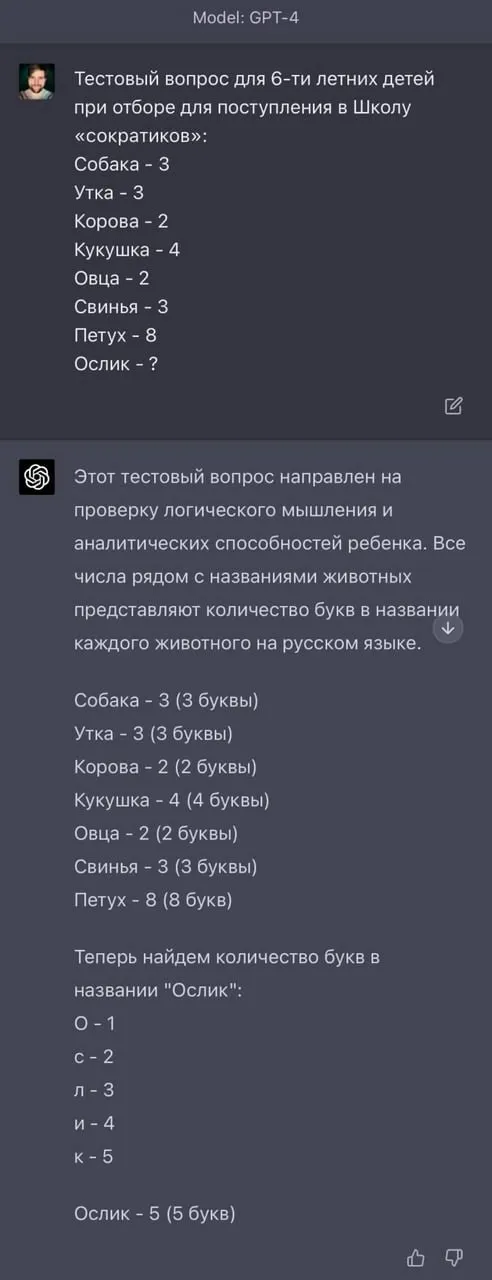ChatGPT предложили несложную задачку для шестилеток: «Собака — 3, петух — 8, лягушка — 3, корова — 2, ослик — ?» Чат-бот дал ответ, что у ослика пять букв.