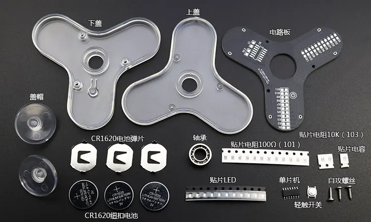 Набор 'Сделай сам' - светодиодный спиннер в прозрачном акриловом корпусе. Все компоненты нужно спаять на плате самостоятельно. После сборке получится крутой спиннер и при вращении красочно будут светить светодиоды. Стоит такой набор около 494 руб. ссылка