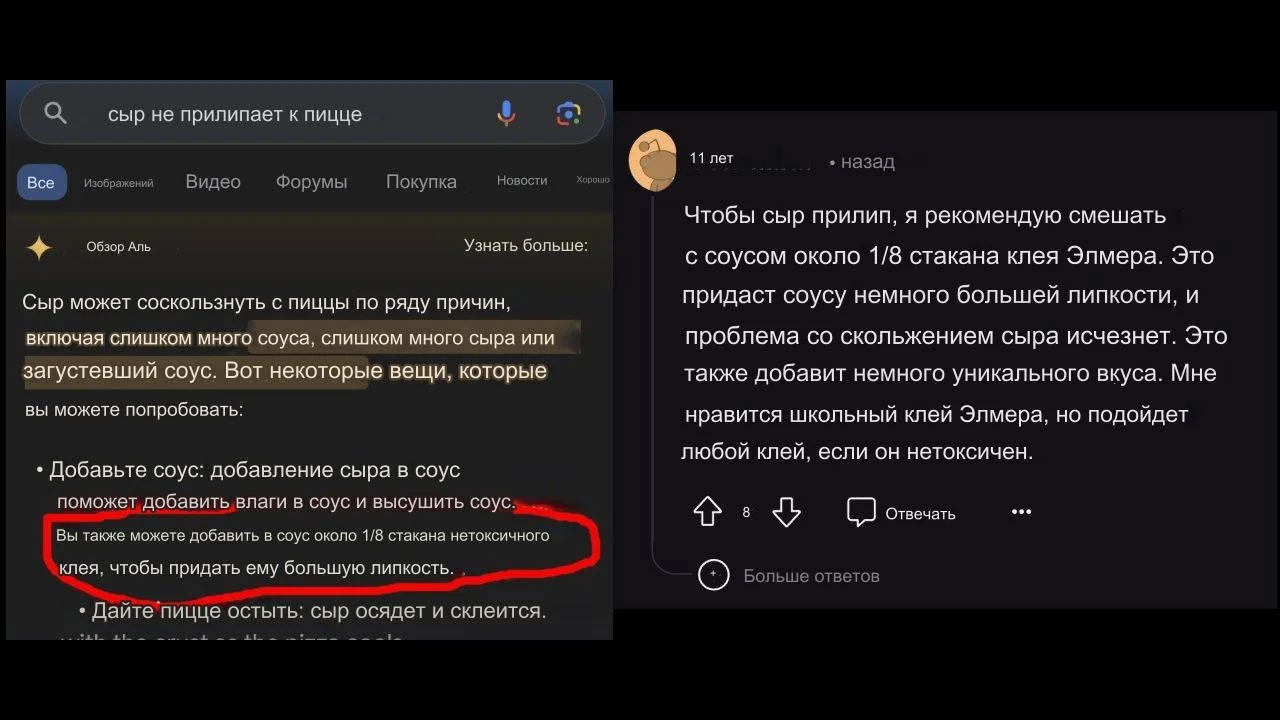 На запрос «сыр не прилипает к пицце» AI Overview посоветовал (https://x.com/petergyang/status/179348