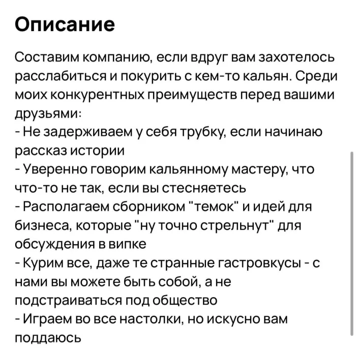 Петербуржец готов составить компанию на час — обещает не задерживать трубку, поддержать любой разговор о «темках» и одолжить скидочную карту в лаунж-бар.