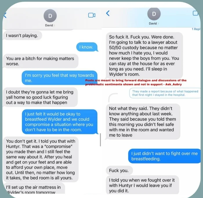 Дэвид: Он не недоношен. Он родился в срок. Это не является необходимым. Он даже больше по сравнению с тем, каким родился я. И ты всё ещё могла попросить медсестер об молокоотсосе. И было научно доказано, что грудное молоко не является более полезным по сравнению с современными детскими смесями