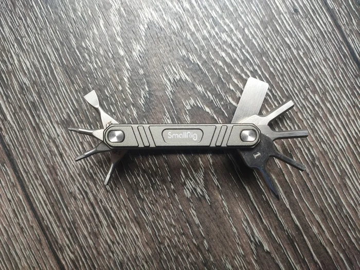 Маленький мультитул от крутого бренда SMALLRIG и по хорошей цене помогает собрать любую камеру с любым обвесом. Чаще всего используемая плоская отвёртка встроена в середину и легко достаётся нажатием кнопки.