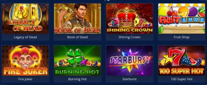 В каталоге собраны лучшие слоты от известных производителей: Igrosoft, Novomatic, Evoplay Entertainment и многих других. Все игры делятся на разделы, такие как «Популярные», «Новинки» и «Классика», что упрощает выбор. Кроме того, пользователи могут сортировать автоматы по разработчикам и добавлять любимые игры в "Избранное".