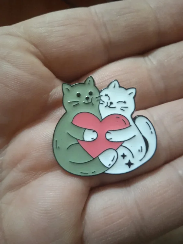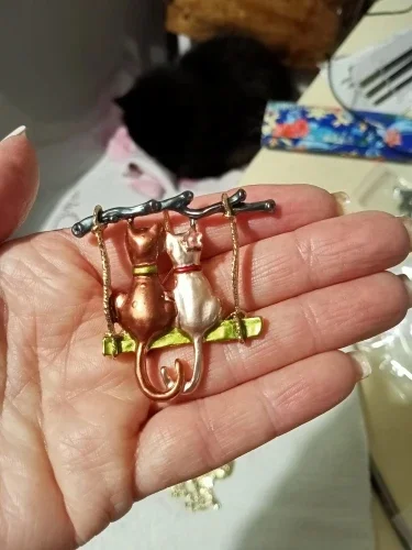 Металлическая эмалированная брошка с двумя котиками и хвостами, создающими сердечко. Стоит такая 57 руб. Ссылка на неё.