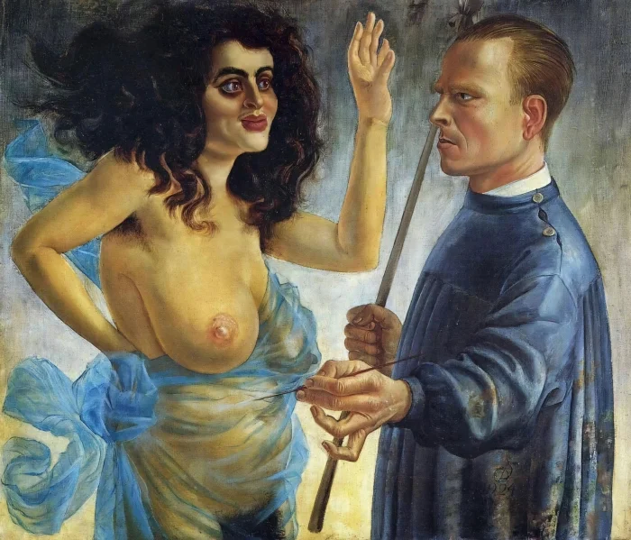 1924 г. Холст, масло, 81 х 95 см. Музей Карла Эрнста Остхауса, Хаген Этот самый странный из всех автопортретов немецкого художника-экспрессиониста открыт для разных интерпретаций. Дикс изображает себя — как он часто это делал — с кистью в руке в процессе рисования, но в данном случает холста нет. Вместо него мы видим пышную женщину с открытой грудью и растрепанными волосами. Несмотря на то, что Дикс называет ее «Музой», она также материальна, как и он. История их взаимоотношений довольно забавна. Музой Отто Дикса в реальности была женщина по имени Марта Кох. Он познакомился с ней в 1921 г., когда рисовал портрет её супруга, доктора Ганса Коха. Как полагается у Музы и Творца случилась Любовь. Марта бросила мужа и ушла к художнику. При этом, бывший супруг переживал недолго. Вскоре он женился на сестре Марты и, что интересно, сохранил с разлучником Диксом приятельские отношения.