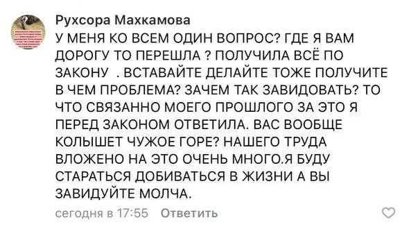 После публикаций Рухсора Макхамова, она выпустила пост, в котором заявила, что все свои достижения она получила самостоятельно. В дальнейшем она намерена продолжать добиваться успехов. Остальным же желает тихо завидовать.
