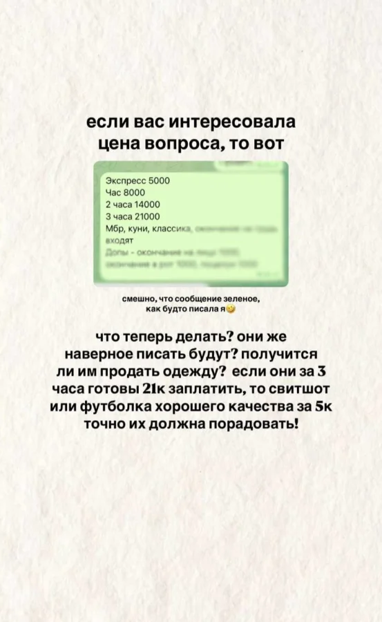 Она задумалась: а что, если использовать эту клиентскую базу для продажи своей продукции? В конце концов, качественные футболки и свитшоты будут стоить значительно дешевле, чем те услуги, которые предлагала предшественница.