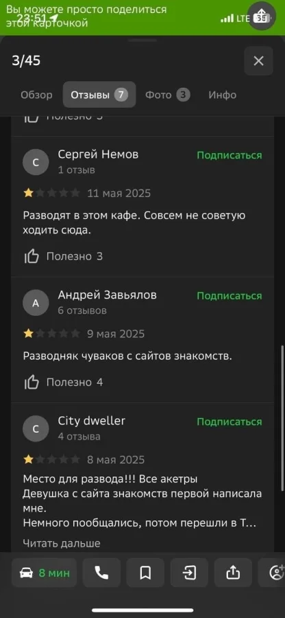 В Москве молодой человек познакомился с девушкой через сайт знакомств и пригласил её на встречу. Она предложила пойти в заведение под названием «3/45» на улице Каспийская, дом 22. После ужина парню предъявили огромный счёт, который он отказался оплачивать. В ответ к нему подошли несколько мужчин нерусской внешности и, угрожая, заставили его заплатить. Молодой человек вызвал полицию, но за это время его спутница успела встретиться с другим мужчиной, который даже не подозревал, что его ждёт.
