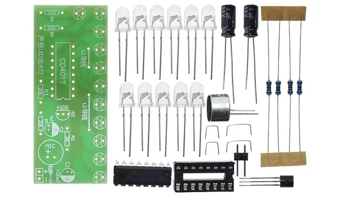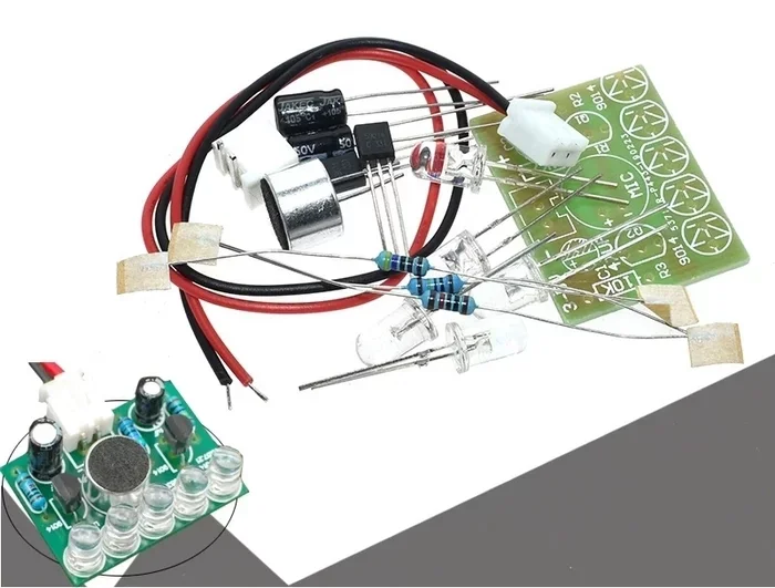 Набор для пайки и сборки платы. От услышанных звуков на плате 'бегают' огоньки. Стоит такой 72 рубля . Ссылка