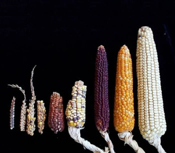 Девять тысячелетий назад привычной нам кукурузы (маиса) не существовало. Её далёким предком было дикорастущее растение теосинте, которое до сих пор произрастает на территории Мексики. Внешне оно напоминало обычную траву с миниатюрными початками – их размер был вшестеро меньше современных кукурузных. Каждый такой початок содержал всего 5-12 мелких твёрдых зёрен, которые осыпались при созревании. Эти зёрна практически не усваивались человеческим организмом. Интересно, что по питательной ценности одно современное кукурузное зерно превосходит целый початок теосинте.
