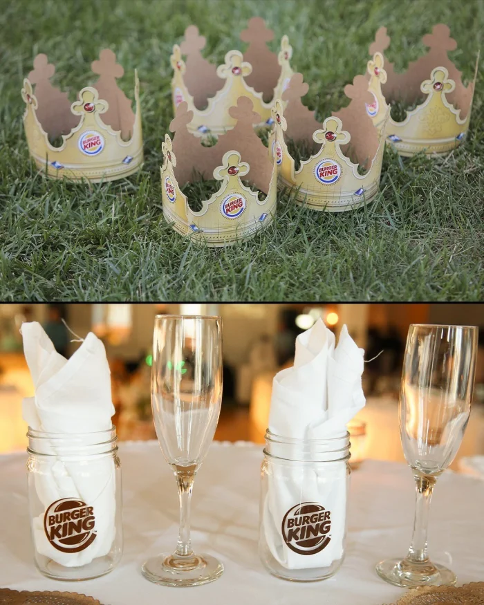 Компания полностью оплатила свадьбу пары. Торжество прошло в фирменном стиле Burger King: гости носили короны, знакомые каждому посетителю ресторанов сети, на декоре и аксессуарах красовался логотип бренда, а сама атмосфера была легкой, веселой и совершенно не пафосной.