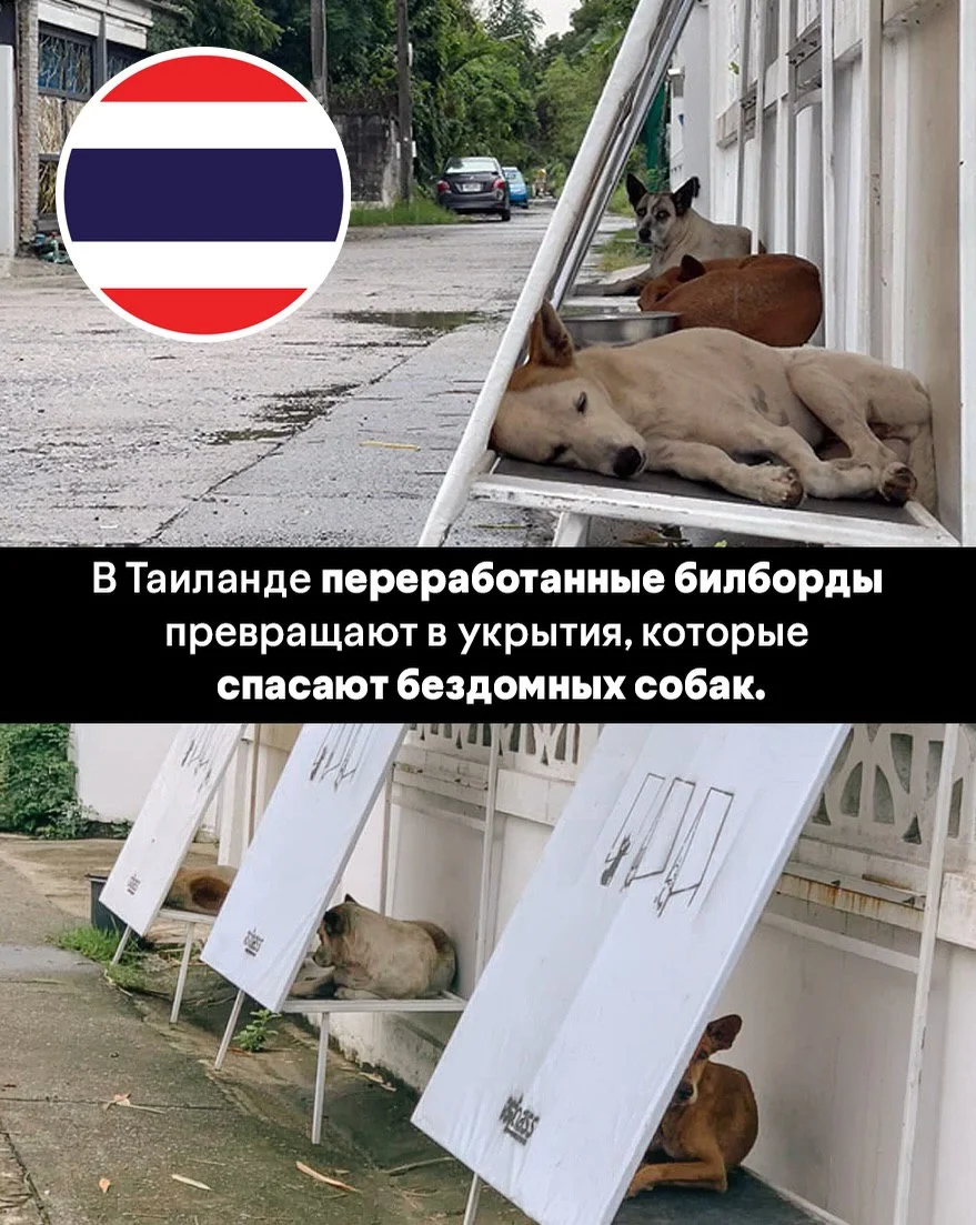 В Таиланде переработанные рекламные билборды превращают в укрытия для бездомных собак. Простая идея помогает животным пережить сезон дождей и жару, одновременно снижая объёмы отходов.