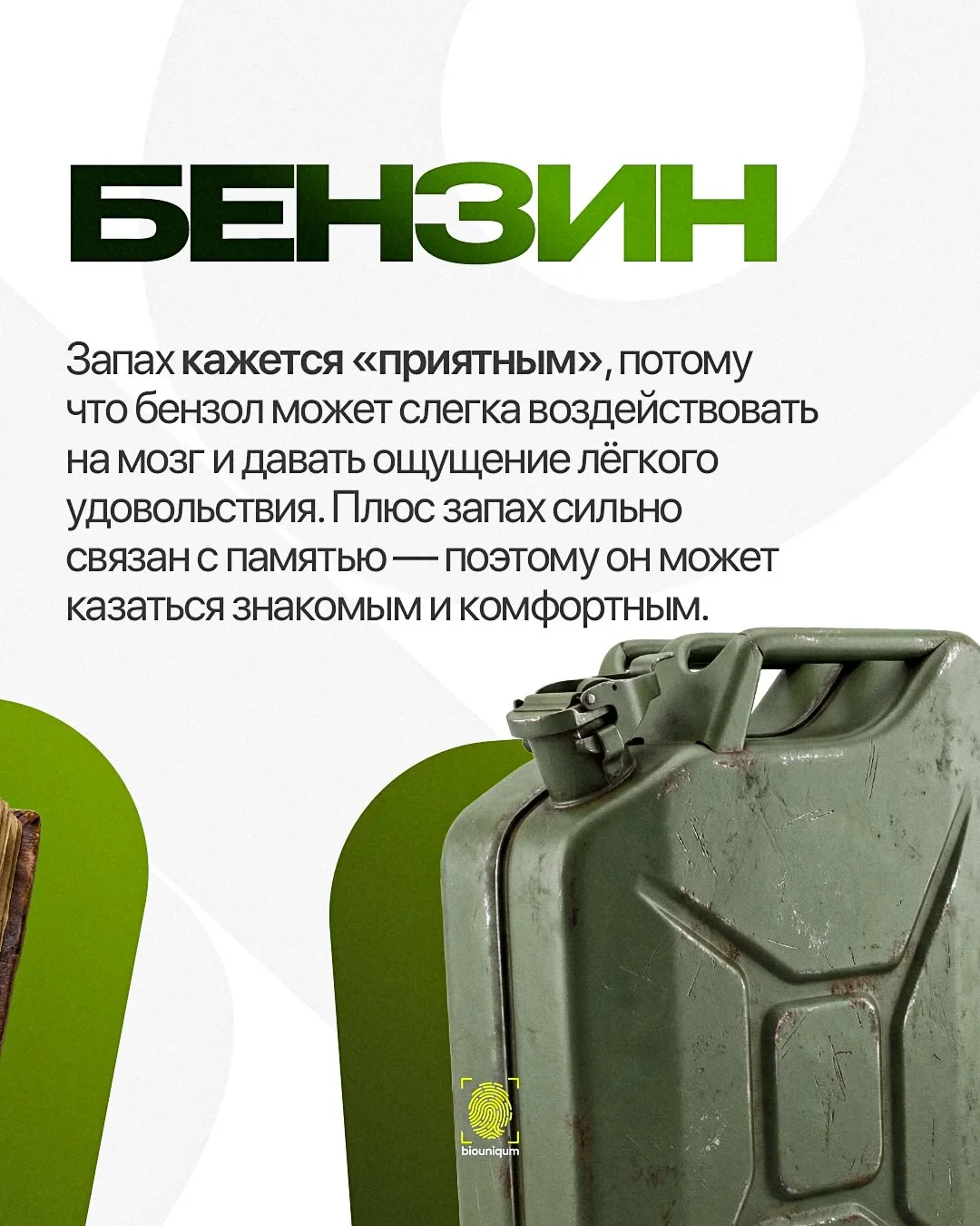 Ещё один популярный пример — запах бензина. Он содержит бензол и другие углеводороды, которые способны влиять на мозг. В малых концентрациях они могут давать ощущение лёгкого расслабления или даже удовольствия.
