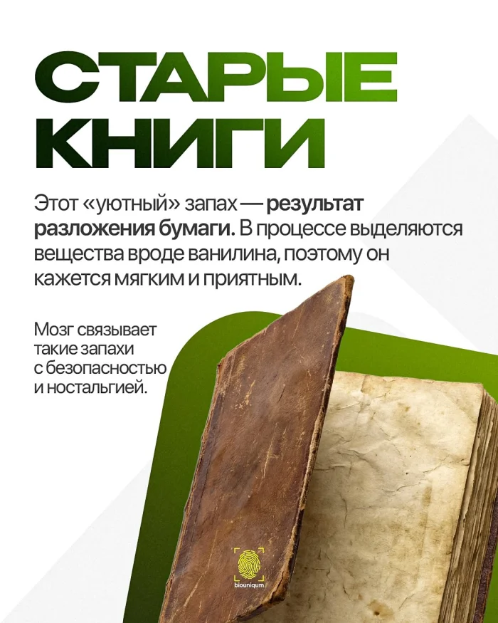 Совсем другой, но не менее интересный случай — запах старых книг. Многие называют его уютным и тёплым. Причина в том, что бумага со временем разлагается и выделяет вещества вроде ванилина и бензальдегида.