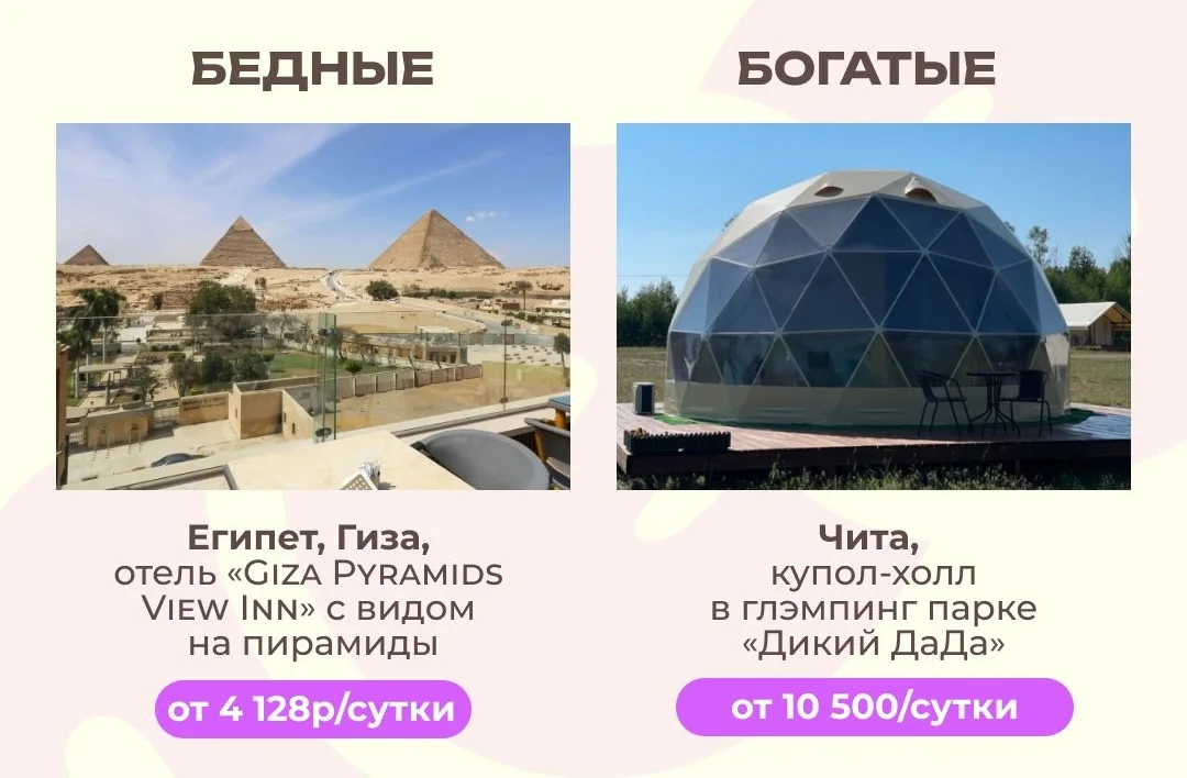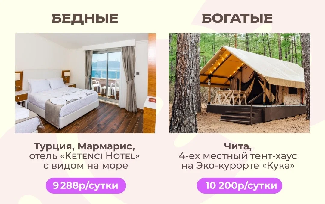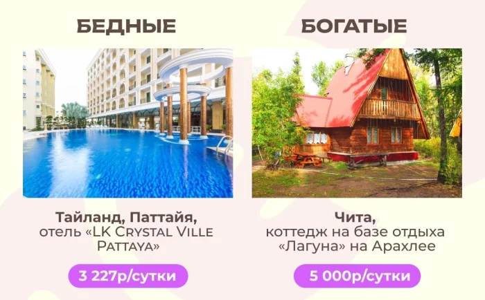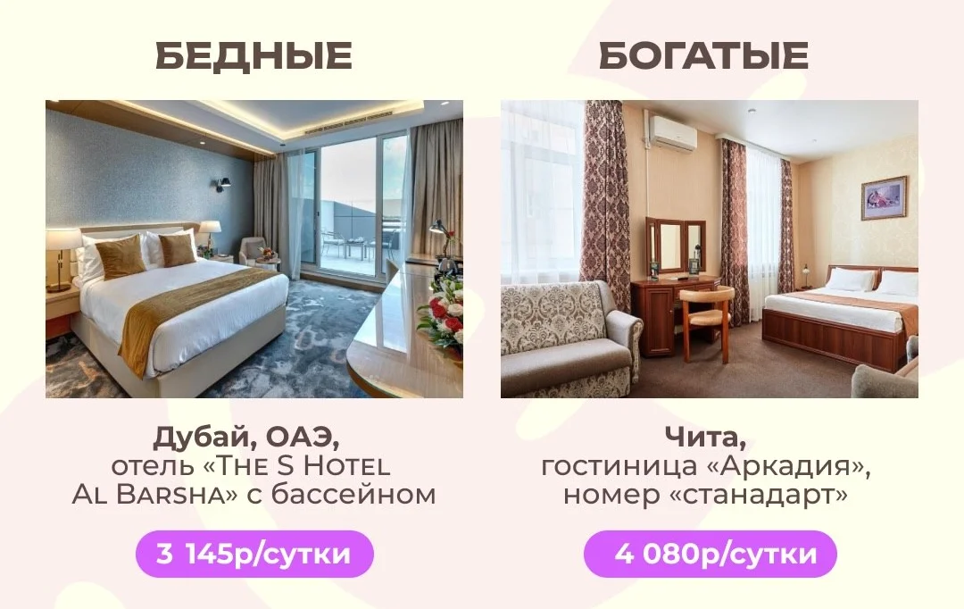 На первом примере «бедные» почему-то живут в Дубае — в отеле с бассейном всего за 3 145 рублей в сутки. А вот «богатые» отправляются в Читу, где за стандартный номер в гостинице придётся отдать уже 4 080 рублей. Видимо, роскошь теперь измеряется не пальмами, а суровостью региона.
