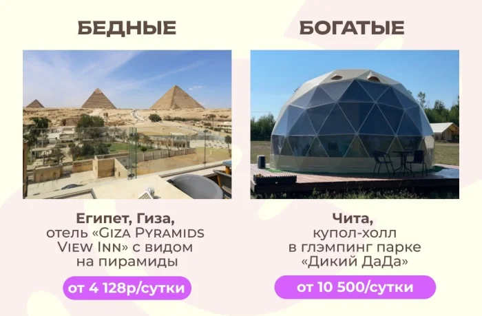 Ну и финальный аккорд — Египет с видом на пирамиды от 4 128 рублей. Казалось бы, куда круче? Но нет — купол в глэмпинг-парке под Читой за 10 500 рублей уверенно забирает звание люкса.