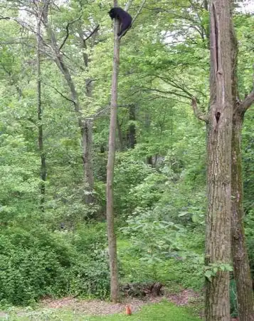 Просидев на дереве минут пятнадцать, мишка решил спуститься, но как только он оказался на земле, на него стал агрессивно надвигаться Джек. Пришлось косолапому снова ретироваться, только уже на другое дерево. Возможно, медведь еще долго сидел бы на ветке, если бы хозяева не позвали защитника домой. Побыв для верности на дереве еще какое-то время, мишка спустился и бросился бежать в лес.